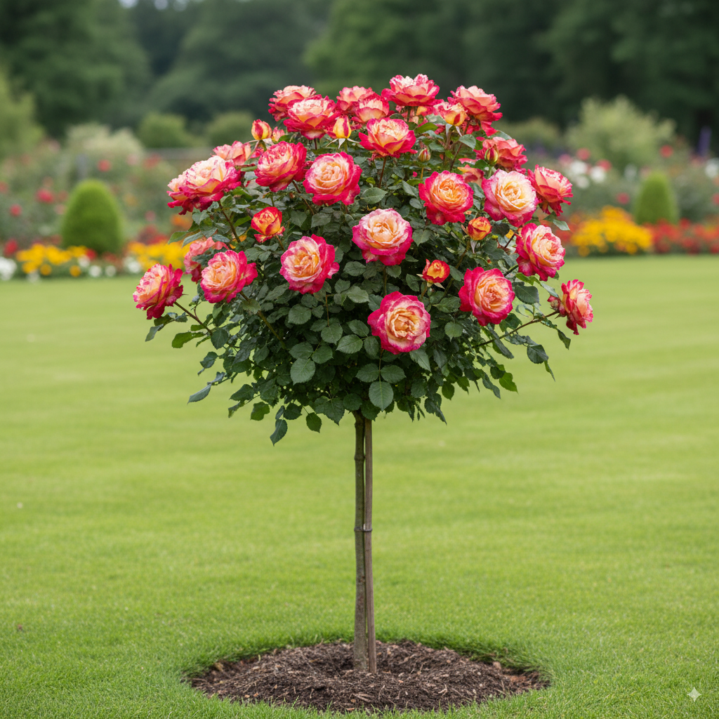 Rosaio ad alberello ‘Hokus Pokus’, capace di donare eleganza e carattere al tuo giardino.