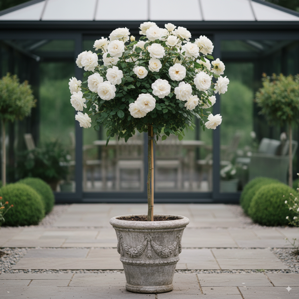 Il rosaio ad alberello ‘Pascali’ è una delle varietà bianche più eleganti e apprezzate, spesso protagonista nei bouquet dei fioristi. Questo ibrido di tè, molto rifiorente, si distingue per i suoi grandi fiori doppi di un bianco luminoso con delicate sfumature avorio e un leggero tono cremoso al centro. È considerato uno dei più raffinati rosai bianchi moderni.