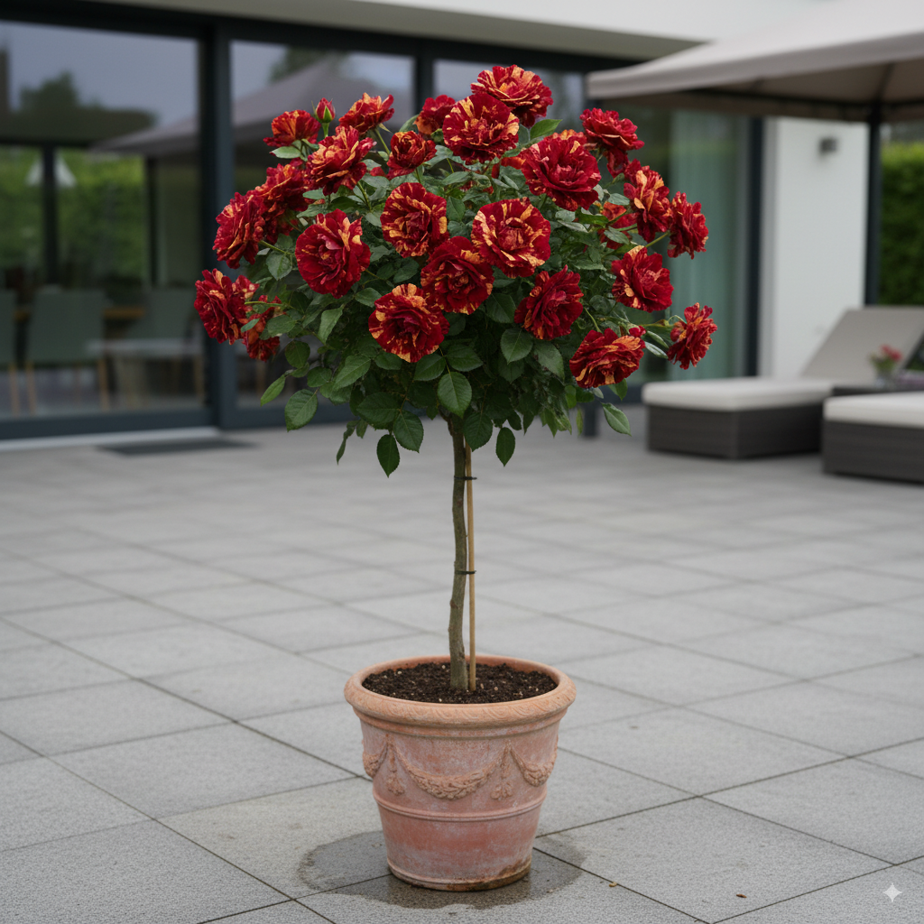 Il rosaio ad alberello ‘Hokus Pokus’ è una delle varietà più affascinanti grazie al suo straordinario gioco di colori: petali vellutati rosso ciliegia scuro attraversati da eleganti striature giallo dorate. Può presentare diverse combinazioni cromatiche, dal rosso intenso con venature color oro fino a tonalità più chiare e sofisticate, rendendo ogni fiore unico.